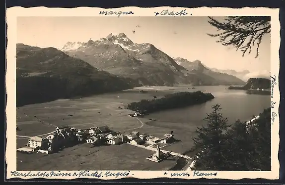 AK Sils, Blick von Platz auf Baselgia, Silser-See und Halbinsel Chastè