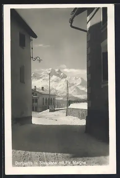 AK Silvaplana, Dorfpartie mit Piz Margna im Schnee