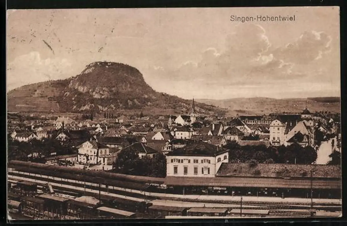 AK Singen-Hohentwiel, Stadtansicht mit Hohentwiel und Bahnhof