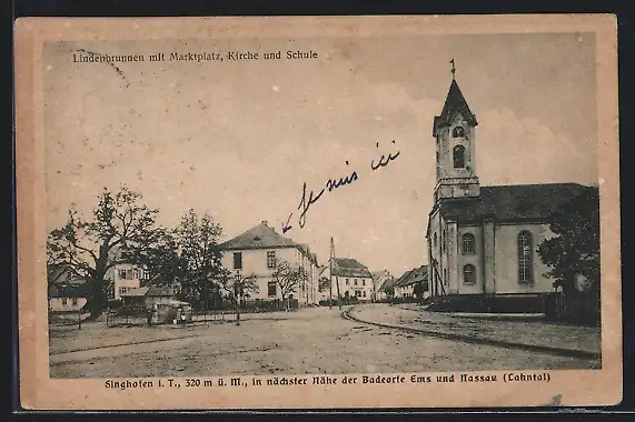 AK Singhofen i. T., Lindenbrunnen mit Marktplatz, Kirche und Schule