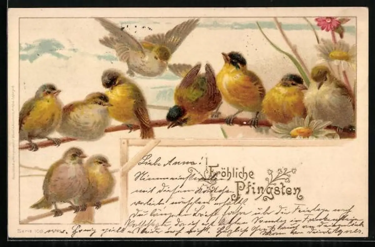 AK Singvögel auf Zweigen, Pfingstgruss