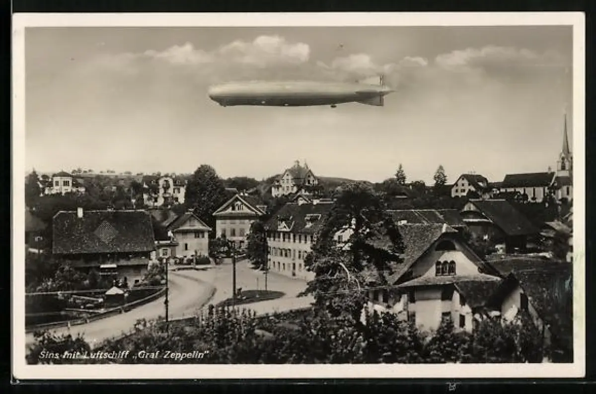 AK Sins, Luftschiff Zeppelin über dem Ort