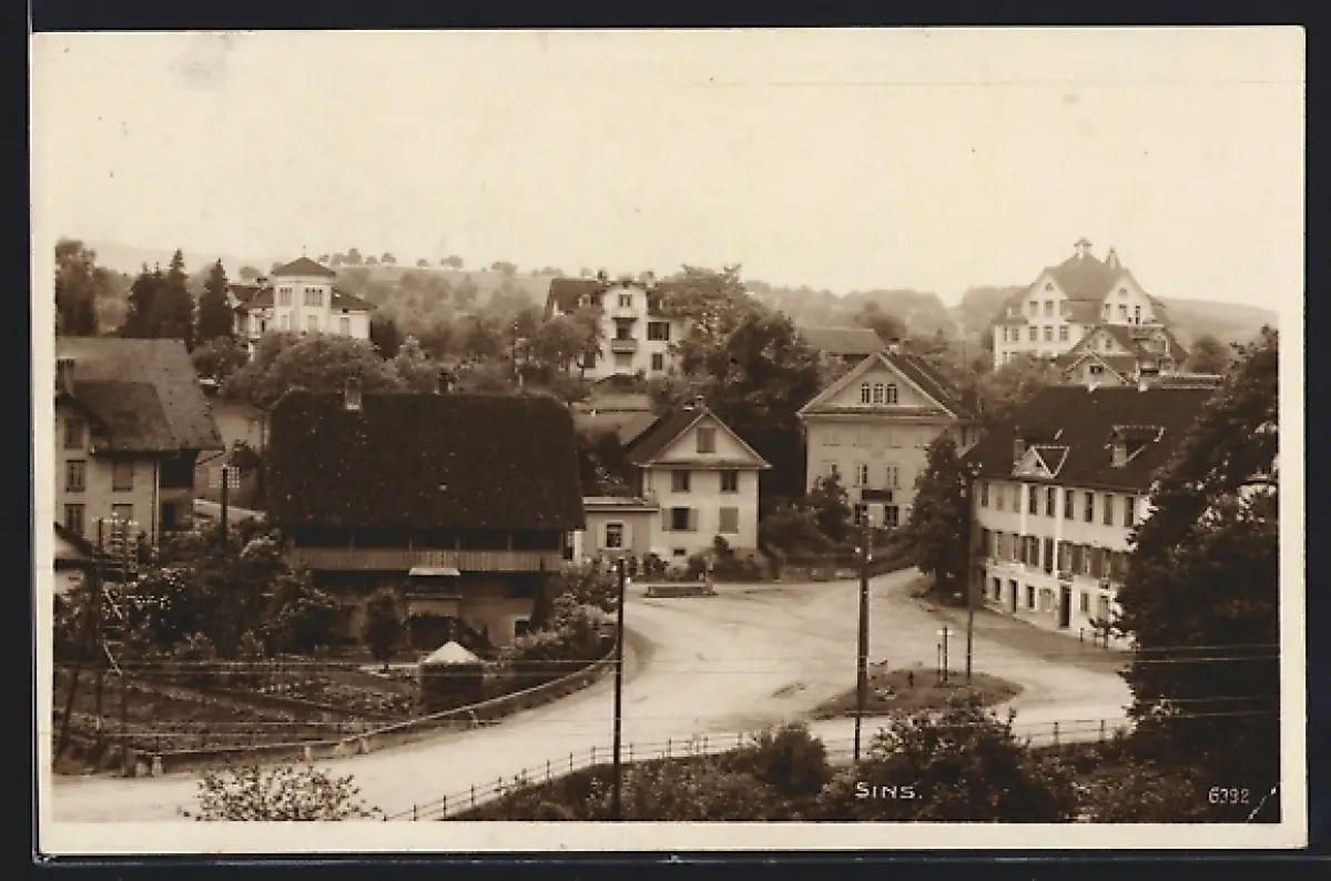 AK Sins, Strassenkreuzung mit Verkehrsinsel, Villen u. Geschäften aus der Vogelschau