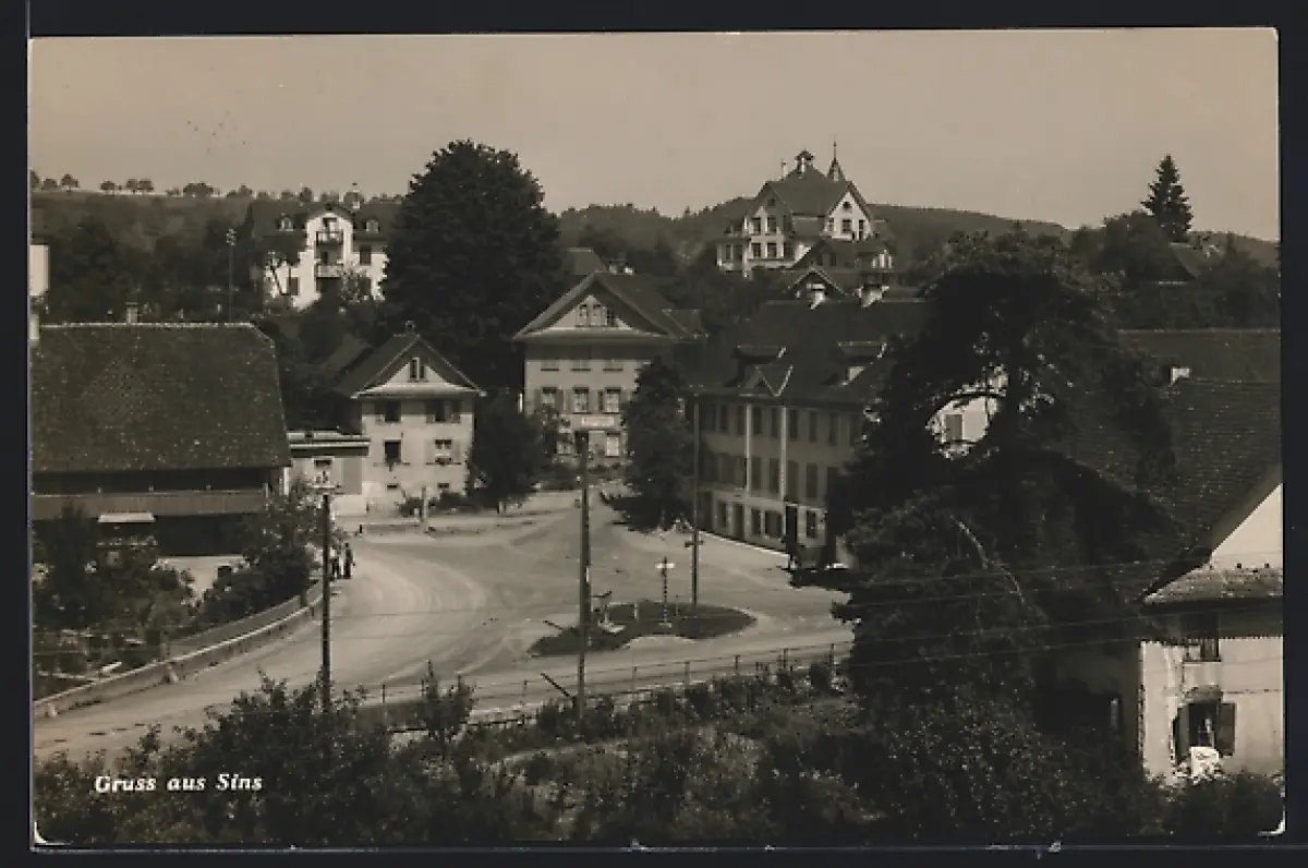 AK Sins, Strassenkreuzung mit Villen u. Geschäften aus der Vogelschau