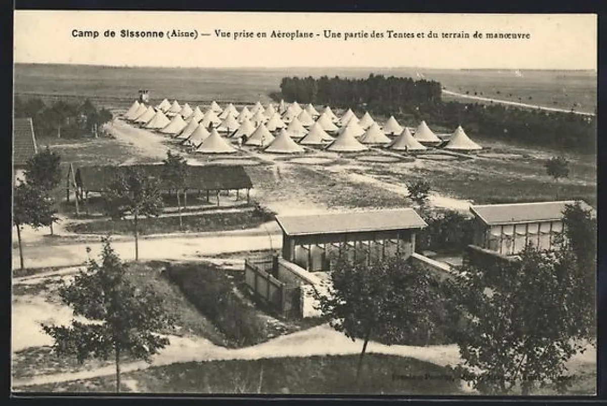 AK Sissonne /Aisne, Vue prise en aéroplane, Une partie des tentes et du terrain de manoeuvre