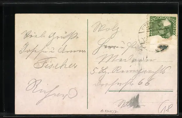 alte Ansichtskarte, gelaufen, Briefmarke entfernt, rückseitig Oberflächenschaden, Abriebspuren li. u. re. oben, guter Zustand