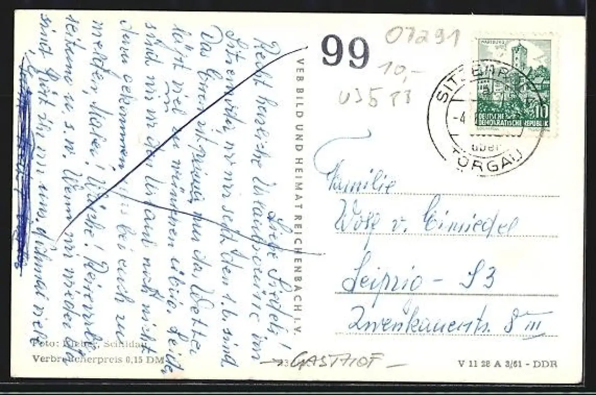 Personenbezogene Daten auf der Rückseite der Karte wurden durch blauen Textmarker unkenntlich gemacht. Die blauen Stellen sind auf die Vorderseite durchgeweicht und wirken sich negativ auf das Postkartenfoto aus