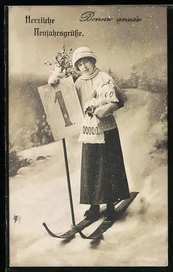 AK Skifahrerin mit Geldsäcken und Kalenderblatt, Neujahrsgruss