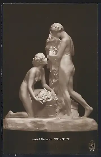 AK Skulptur Weinernte, hübsche Frauen nackt bei der Winernte, von Josef Limburg