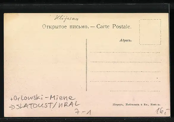 Personenbezogene Daten auf der Rückseite der Karte wurden durch blauen Textmarker unkenntlich gemacht. Die blauen Stellen sind auf die Vorderseite durchgeweicht und wirken sich negativ auf das Postkartenfoto aus