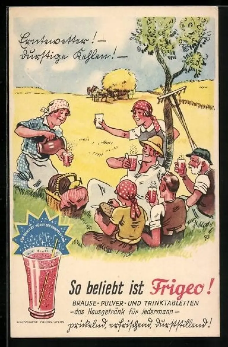AK So beliebt ist Friegeo, Brause-Pulver- und Trinktabletten, Bauersfrau schenkt Brause ein, Reklame
