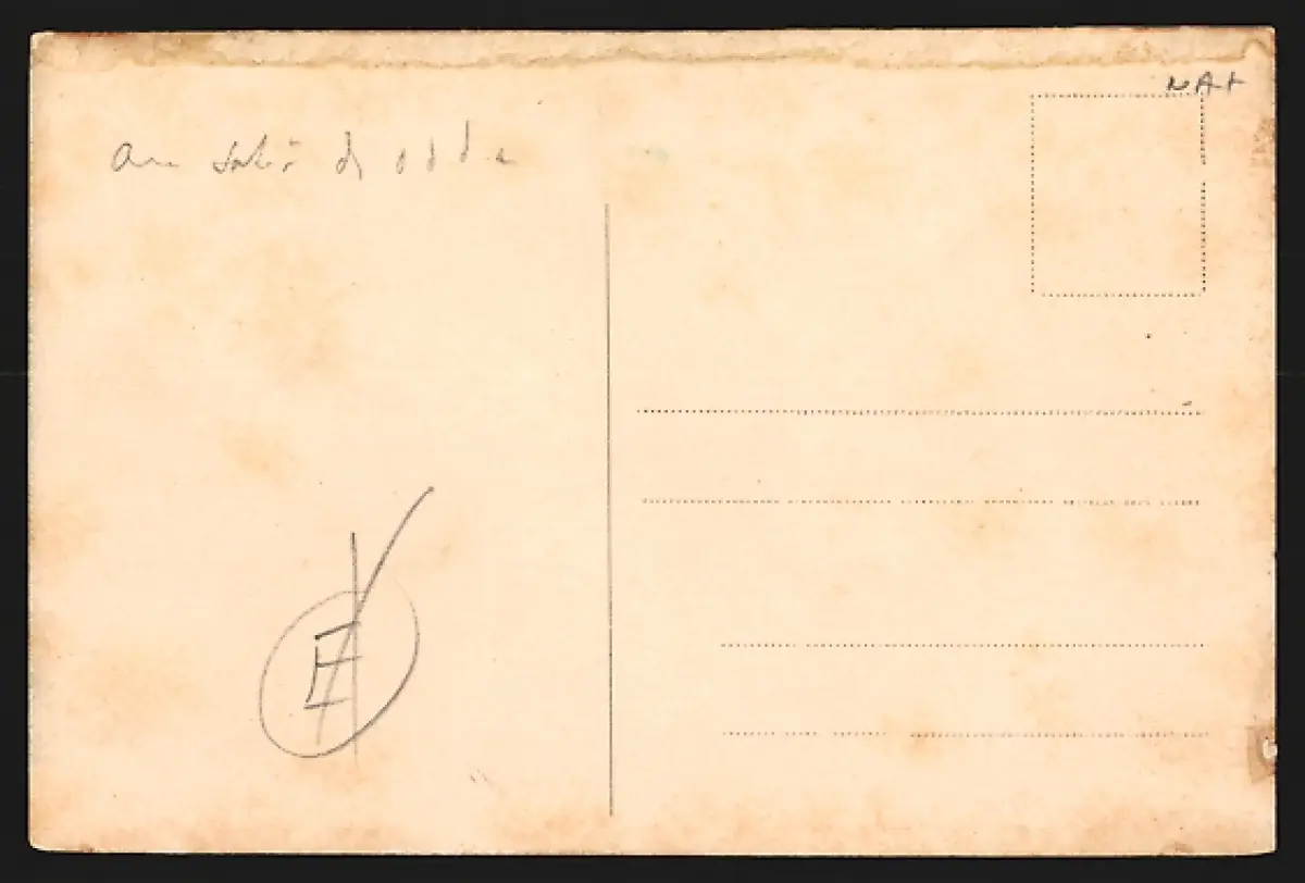 Personenbezogene Daten auf der Rückseite der Karte wurden durch blauen Textmarker unkenntlich gemacht. Die blauen Stellen sind auf die Vorderseite durchgeweicht und wirken sich negativ auf das Postkartenfoto aus