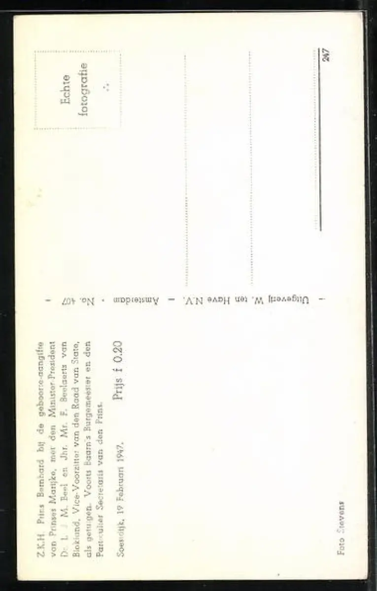 AK Soestdijk, Z.K.H. Prins Bernhard bij de geboorte-aangifte van Prinses Marijke met Minister-Presidente Beel 1947