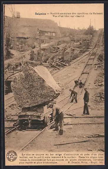 AK Soignies, Société anonyme des carrières du Hainaut, Vue d`un bloc sur chariot
