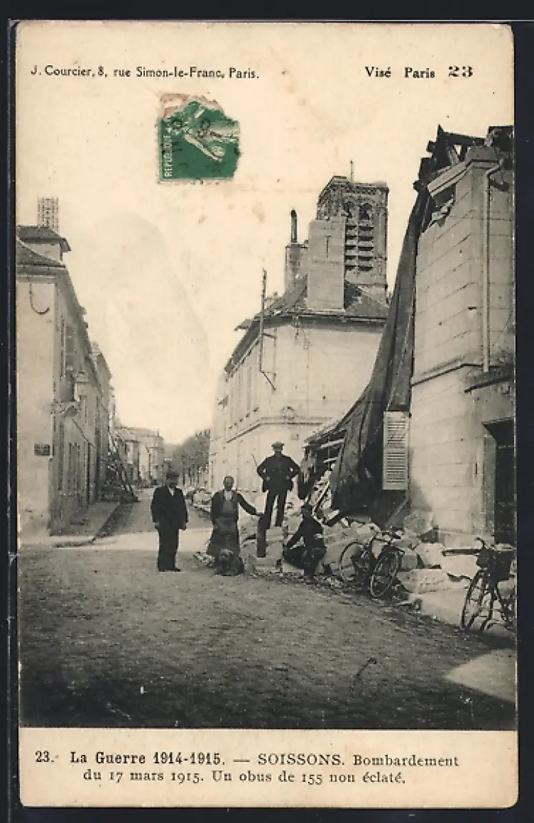 AK Soissons, Bombardement du 17 mars 1915 avec un obus de 155 non éclaté