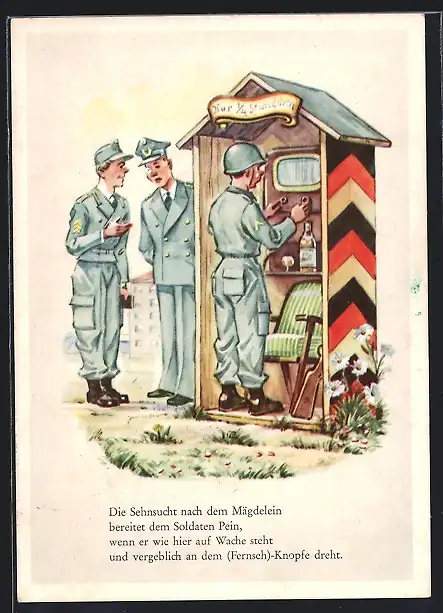 AK Soldat am Wachhäuschen dreht an den Knöpfen des Fernsehers