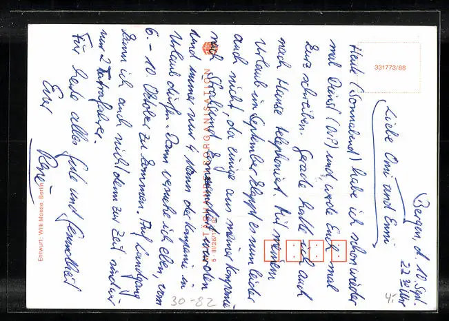 Personenbezogene Daten auf der Rückseite der Karte wurden durch blauen Textmarker unkenntlich gemacht. Die blauen Stellen sind auf die Vorderseite durchgeweicht und wirken sich negativ auf das Postkartenfoto aus