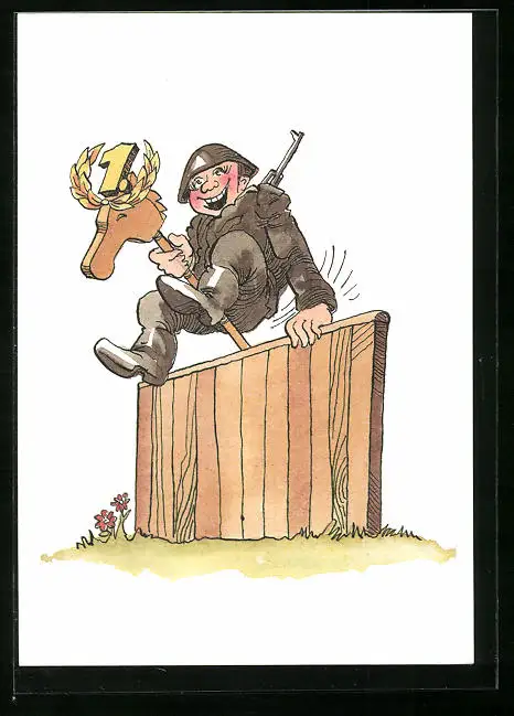 AK Soldat der NVA überwindet mit Steckenpferd ein Hindernis