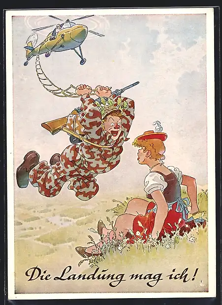 AK Soldat in Tarnanzug landet am liebsten auf jungen Damen