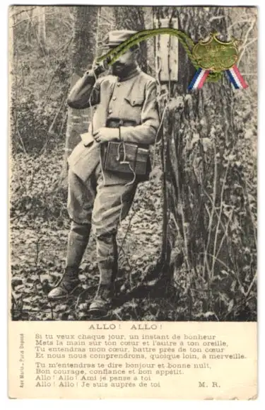 AK Soldat in Uniform mit dem Feldtelefon, aus dem Hörer kommt ein echter Anhänger aus Stoff, Vive la France