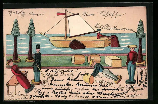 AK Soldat mit Frau, Im Hintergrund Segelboot, Holzspielzeug