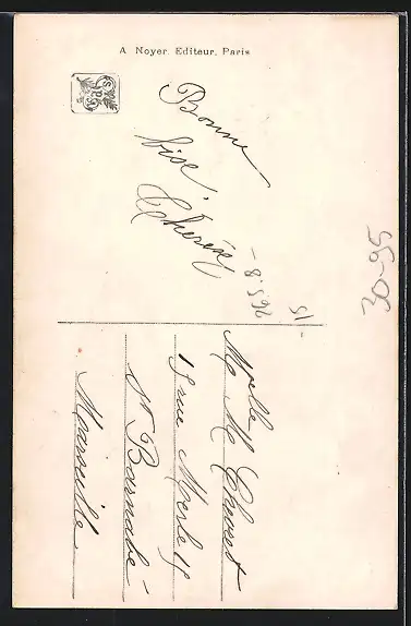 Personenbezogene Daten auf der Rückseite der Karte wurden durch blauen Textmarker unkenntlich gemacht. Die blauen Stellen sind auf die Vorderseite durchgeweicht und wirken sich negativ auf das Postkartenfoto aus