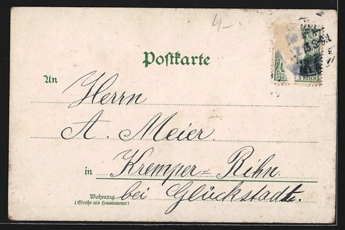 Personenbezogene Daten auf der Rückseite der Karte wurden durch blauen Textmarker unkenntlich gemacht. Die blauen Stellen sind auf die Vorderseite durchgeweicht und wirken sich negativ auf das Postkartenfoto aus