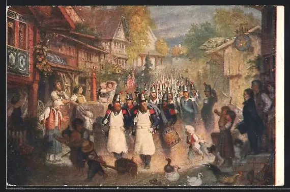 AK Soldaten der schweizer Armee in Uniform marschieren durch ein St. Gallisches Dorf
