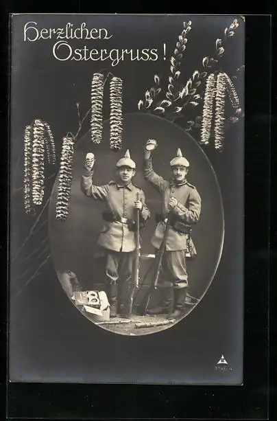 AK Soldaten mit Pickelhaube und Ostereiern, Ostergruss