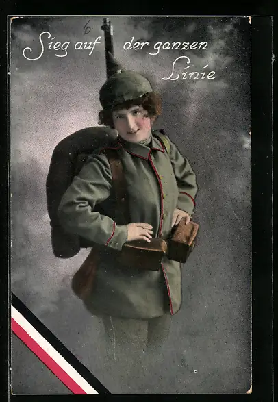 AK Soldatin in Uniform mit geschulterten Gewehr und Pickelhaube