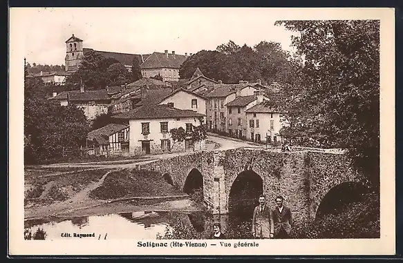 AK Solignac, Vue générale avec pont en pierre et village en arrière-plan