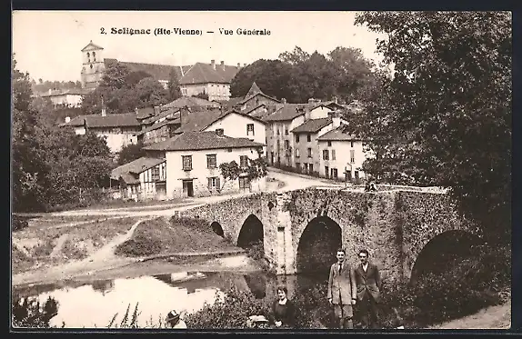 AK Solignac, Vue générale avec pont en pierre et village en arrière-plan