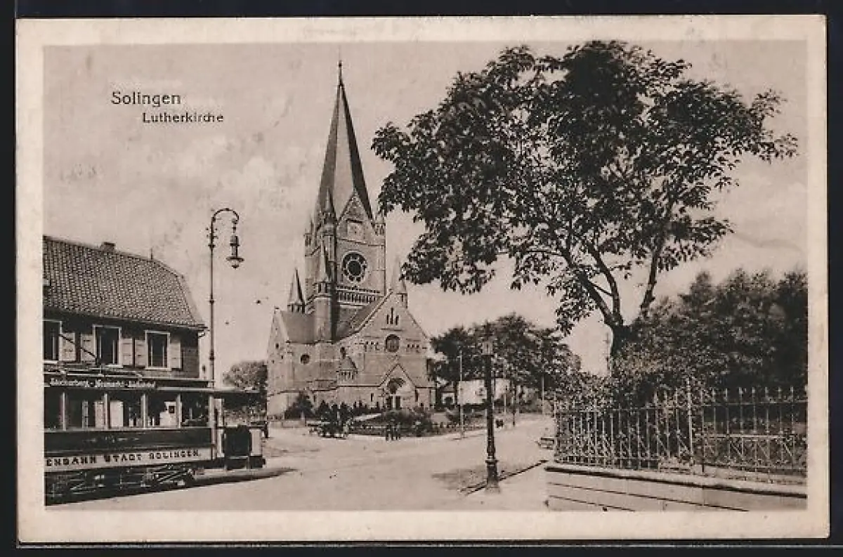 AK Solingen, Lutherkirche mit Strassenbahn