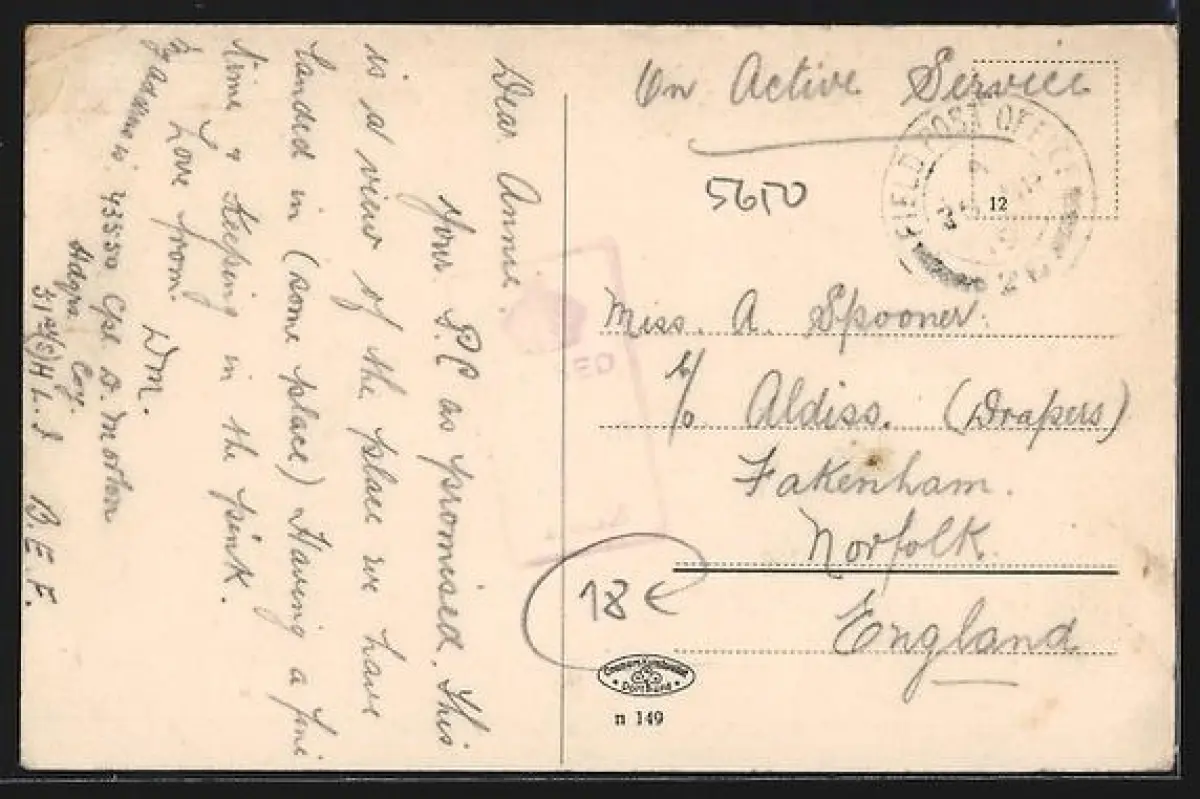 Personenbezogene Daten auf der Rückseite der Karte wurden durch blauen Textmarker unkenntlich gemacht. Die blauen Stellen sind auf die Vorderseite durchgeweicht und wirken sich negativ auf das Postkartenfoto aus