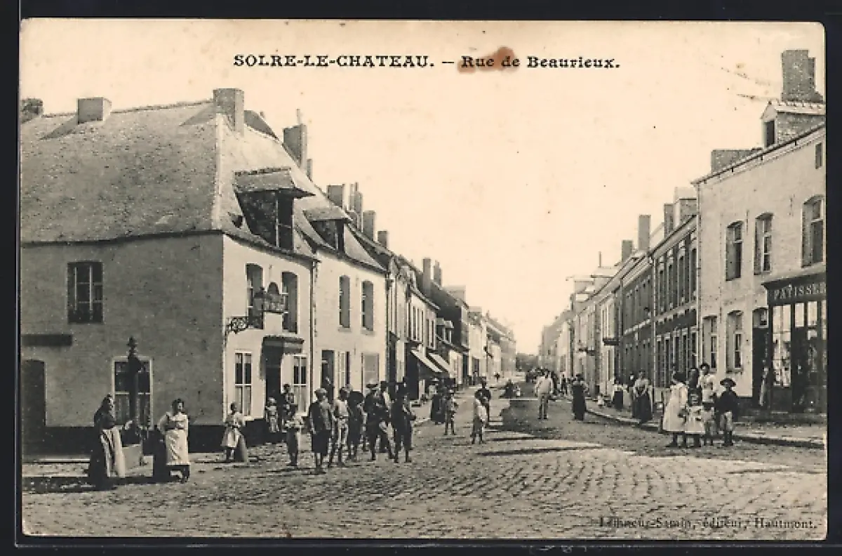 AK Solre-le-Château, Rue de Beaurieux animée avec passants et bâtiments anciens