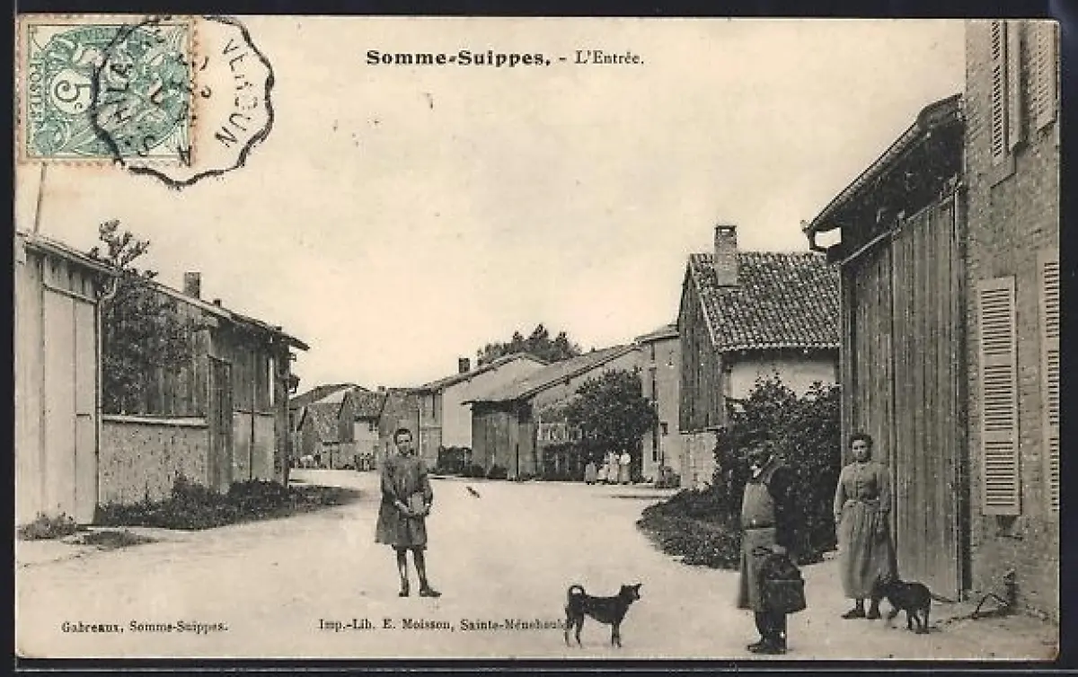 AK Somme-Suippes, L`Entrée du village avec habitants et chiens