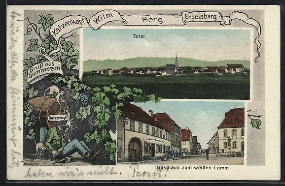 AK Sommerach, Gasthaus zum weissen Lamm, Totalansicht, Katzenkopf, Wilm, Berg, Engelsberg