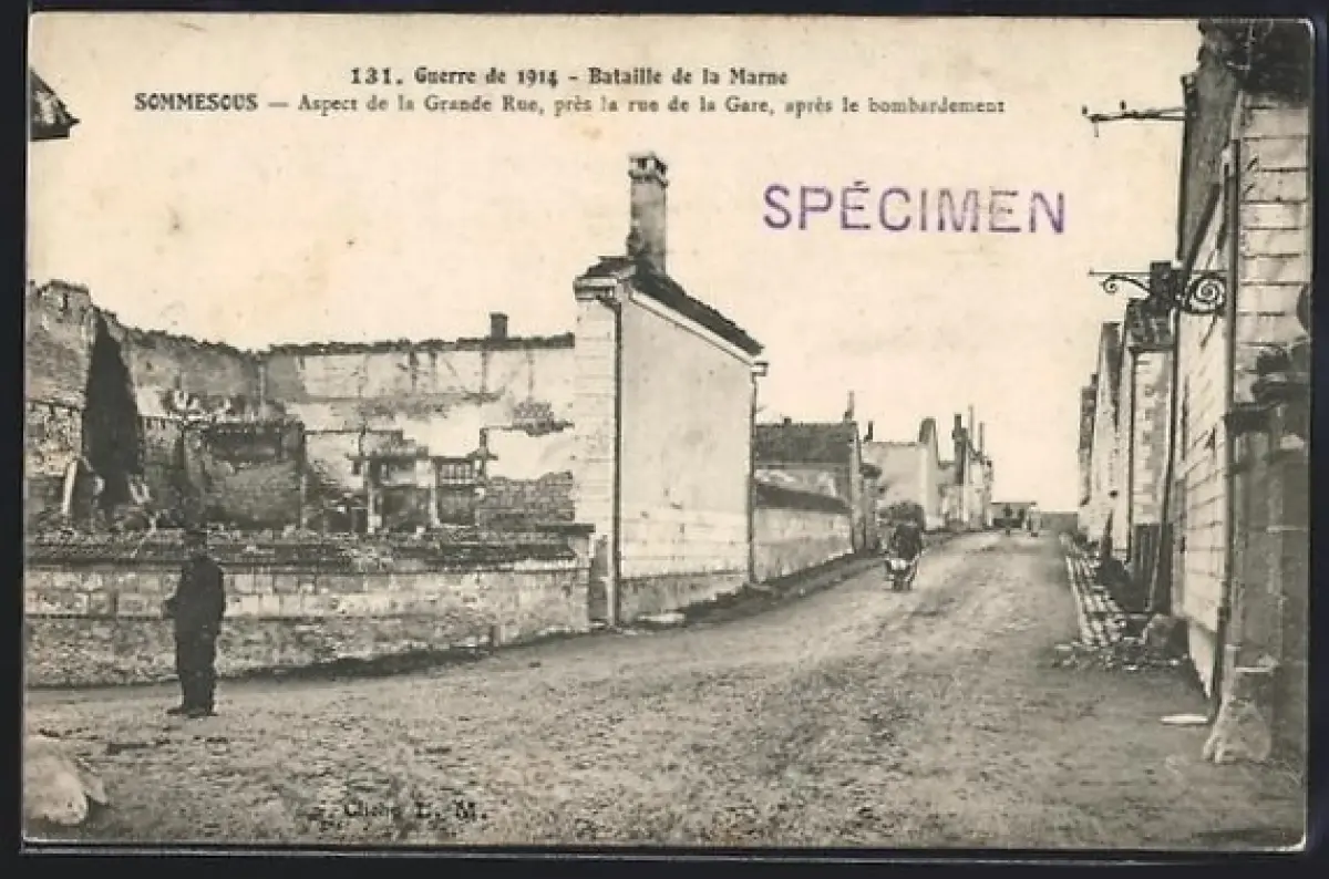 AK Sommesous, Aspect de la Grande Rue, près la rue de la Gare, après le bombardement