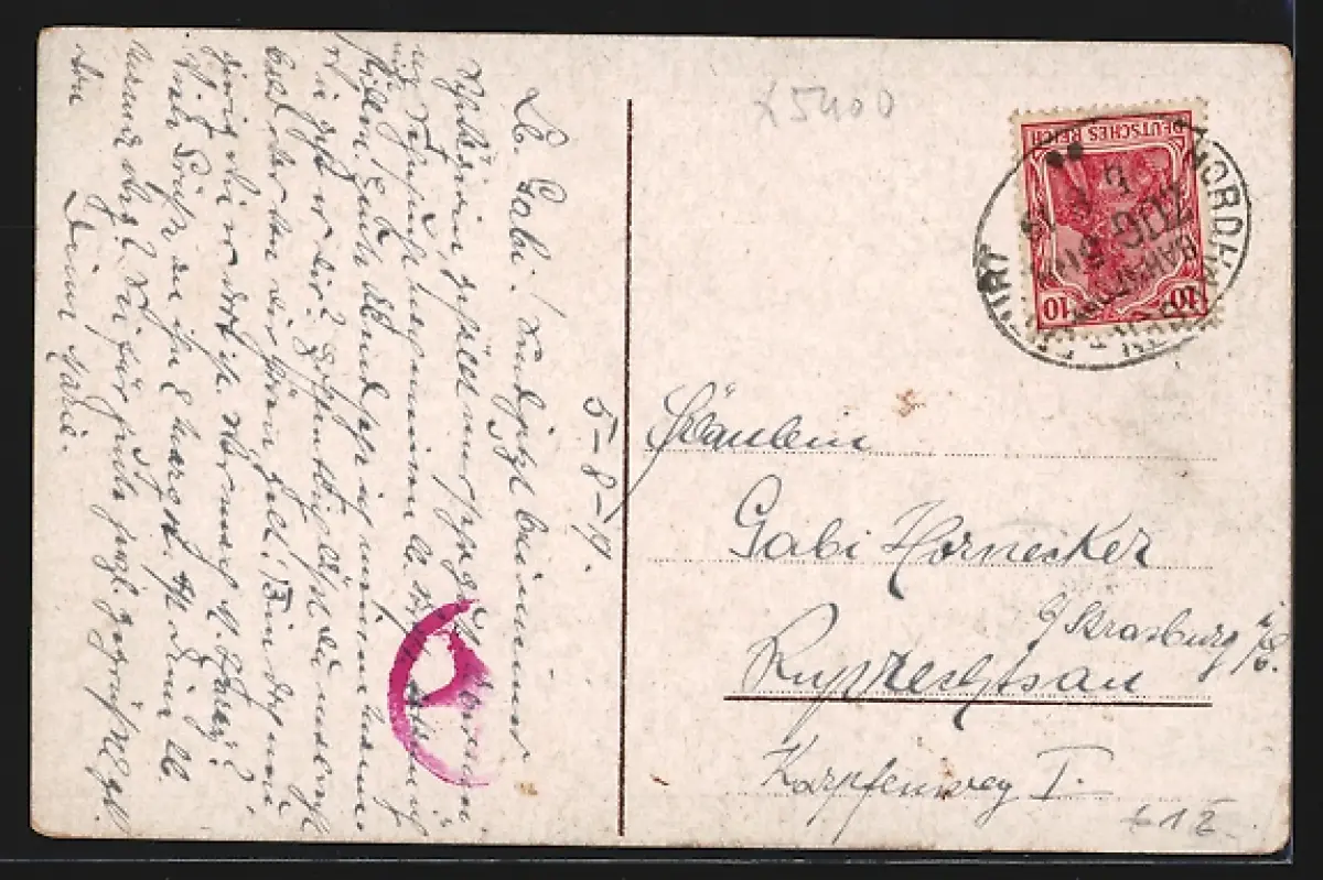 Personenbezogene Daten auf der Rückseite der Karte wurden durch blauen Textmarker unkenntlich gemacht. Die blauen Stellen sind auf die Vorderseite durchgeweicht und wirken sich negativ auf das Postkartenfoto aus