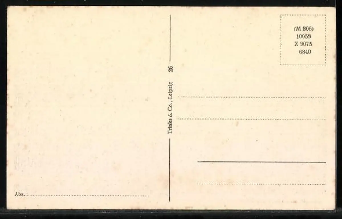 Personenbezogene Daten auf der Rückseite der Karte wurden durch blauen Textmarker unkenntlich gemacht. Die blauen Stellen sind auf die Vorderseite durchgeweicht und wirken sich negativ auf das Postkartenfoto aus