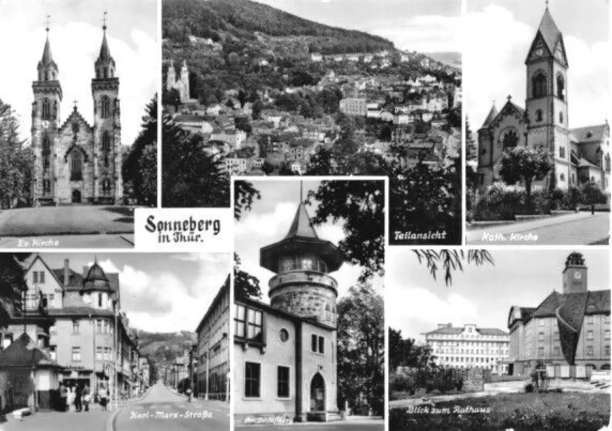 Ansichtskarte Sonneberg sechs Abb. - Ev. Kirche, Teilansicht, Kath. Kirche, Karl-Marx-Str., Am Schloßberg, Blick zum Rathaus Erhaltung I-II, postalisch gelaufen, gestempelt: Berlin, 7.8.78 Druckvermerk: 1978 Herstellungsland: DDR Verlag: Straub & Fischer, Meiningen - 7244