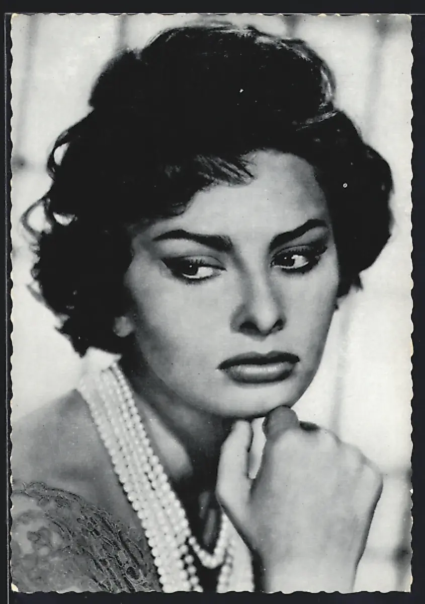 AK Sophia Loren mit Schmollmund und Perlenkette, Portrait