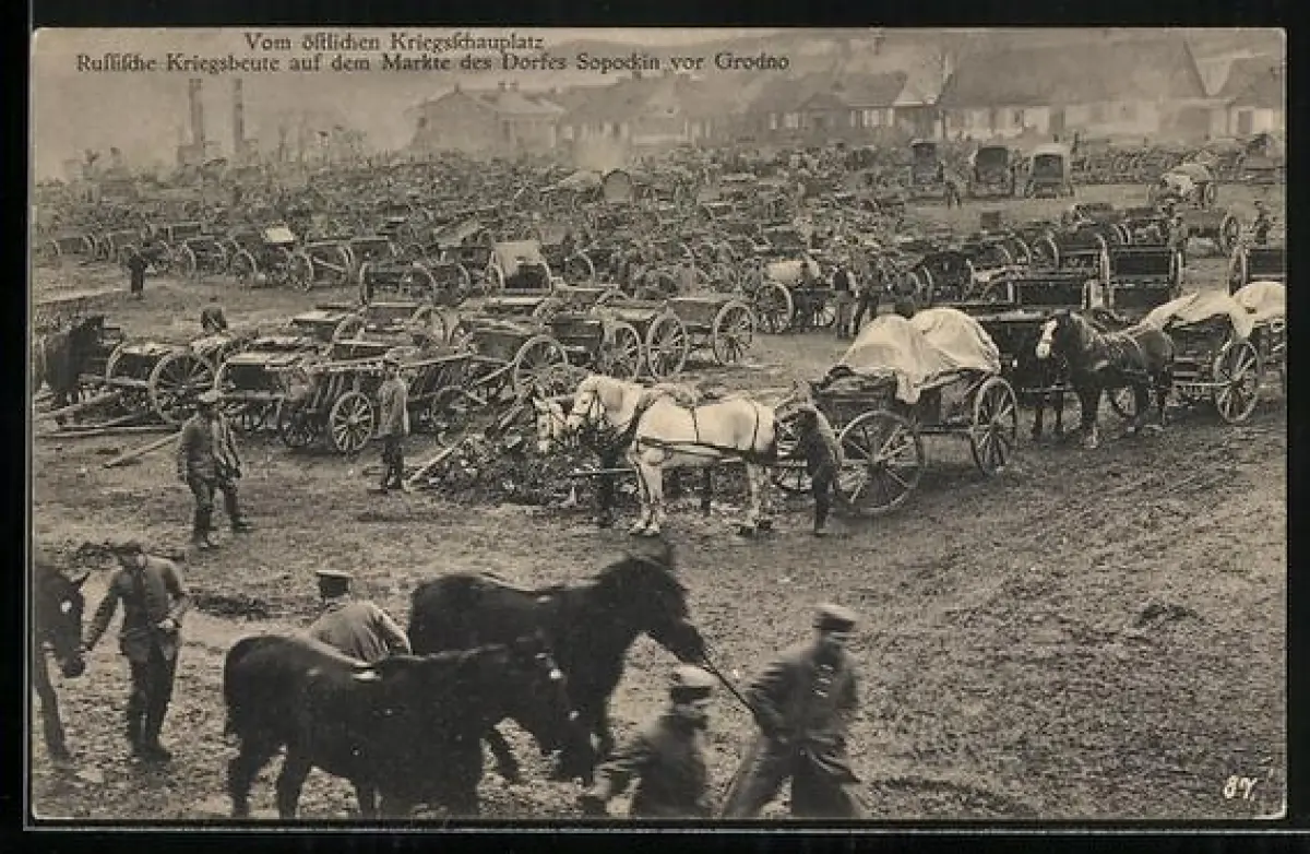 AK Sopockin, Russische Kriegsbeute auf den Markte des Dorfes