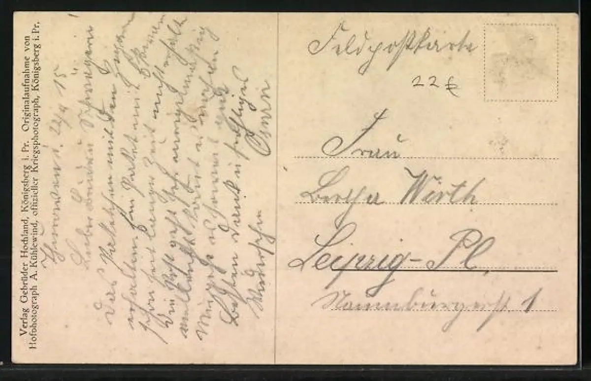 Personenbezogene Daten auf der Rückseite der Karte wurden durch blauen Textmarker unkenntlich gemacht. Die blauen Stellen sind auf die Vorderseite durchgeweicht und wirken sich negativ auf das Postkartenfoto aus