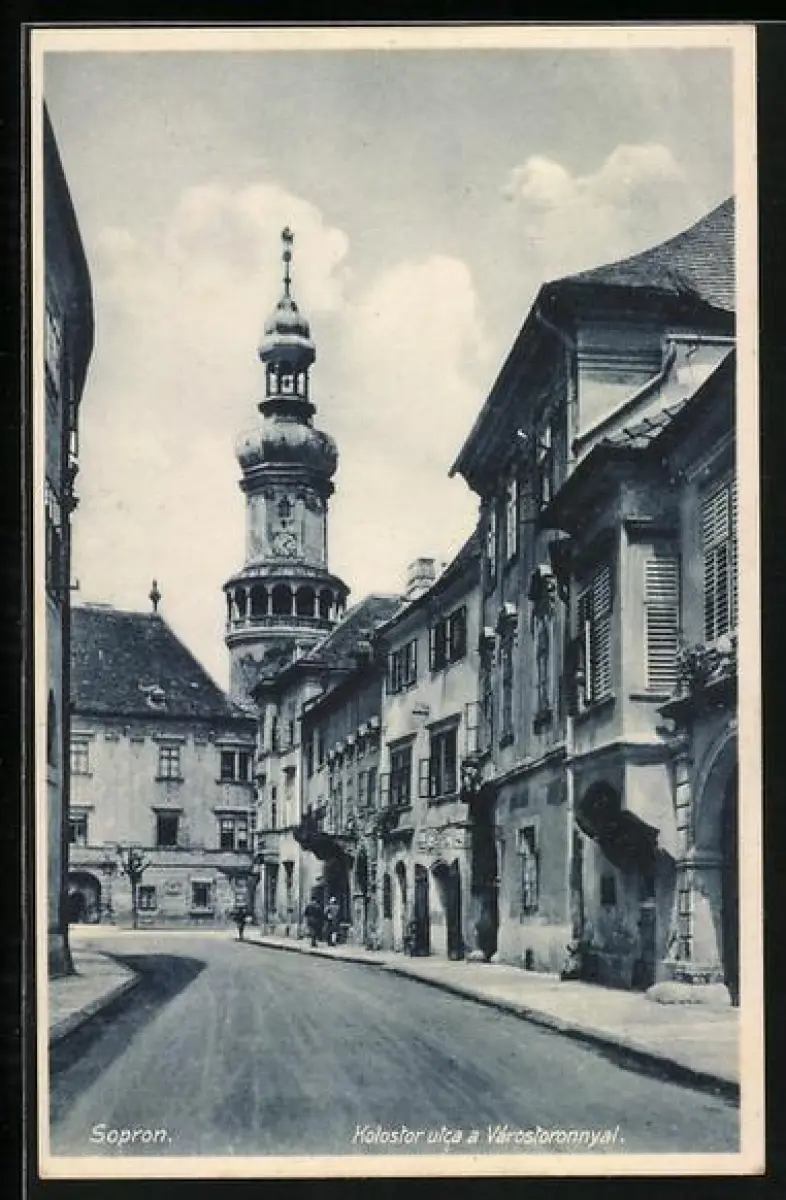AK Sopron, Kolostor utca a Varostoronnyal, Klostergasse mit Stadtturm