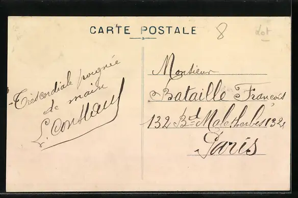 Personenbezogene Daten auf der Rückseite der Karte wurden durch blauen Textmarker unkenntlich gemacht. Die blauen Stellen sind auf die Vorderseite durchgeweicht und wirken sich negativ auf das Postkartenfoto aus