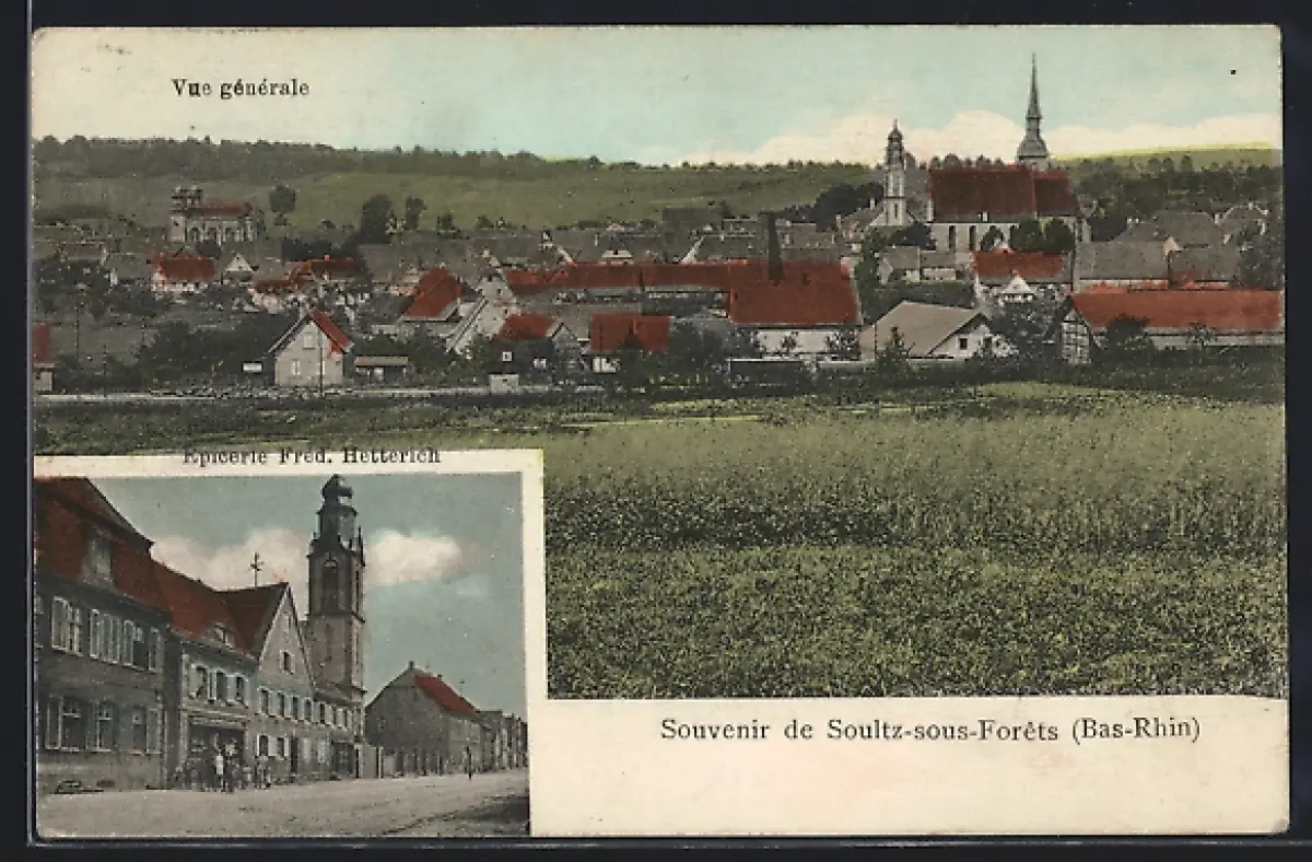 AK Soultz-sous-Forêts, Vue générale et épicerie Fred. Huterich