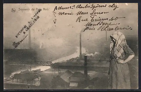 AK Souvenir de Pays Noir, Arbeiterin schaut auf die Kohleanlagen