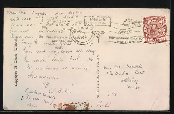Personenbezogene Daten auf der Rückseite der Karte wurden durch blauen Textmarker unkenntlich gemacht. Die blauen Stellen sind auf die Vorderseite durchgeweicht und wirken sich negativ auf das Postkartenfoto aus