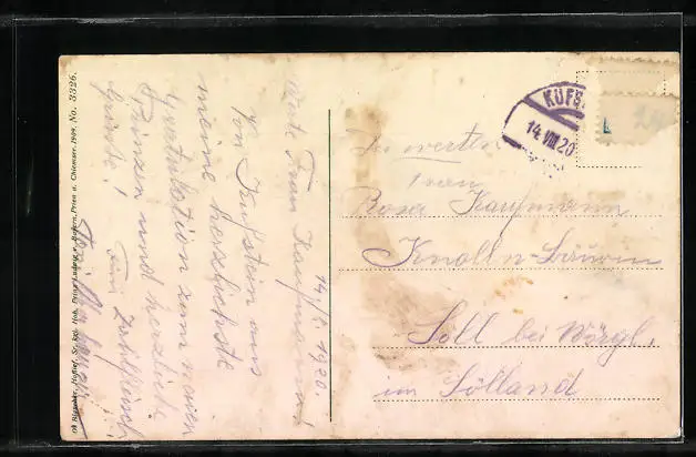 gelaufen 1920, Briefmarke entfernt, rückseitig Klebe- und Papierreste, guter Zustand
